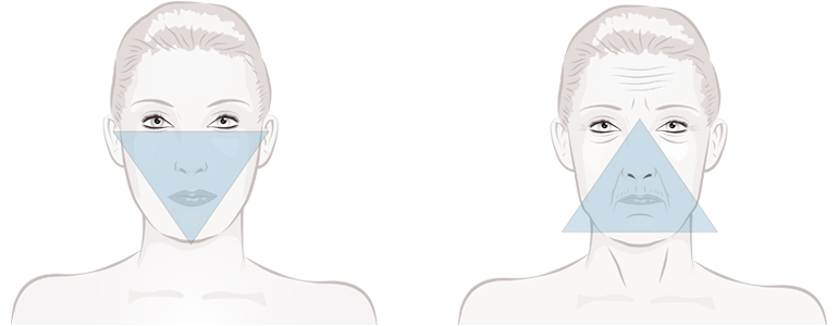 Der natürliche Alterungsprozess bedeutet nicht, auf Schönheit und ein jugendliches Aussehen verzichten zu müssen. Der Alterungsprozess, der etwa ab dem 30. Lebensjahr einsetzt, kehrt das so genannte „Dreieck der Schönheit“ um. Als Teenager und in unseren 20ern haben wir hohe Wangenknochen, volle Wangen und eine gut definierte Kinnpartie, doch dieses Dreieck entwickelt sich mit der Zeit in die andere Richtung. Das Gewebe erschlafft und